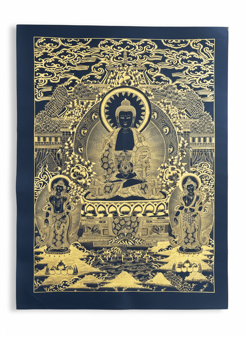 Изысканная тханка “Будда Шакьямуни”, выполненная в редкой технике золотой росписи по чёрному фону — символ мудрости и просветления.